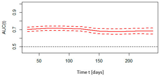 The changes in the area under the receiver operating characteristic curve (AUC) for CHA2DS2-VASc predictive abilities of all-cause death in relation to time. Explanations: AUC(t)—area under receiver operating curve as a function of time (solid line); dashed lines determine 95% confidence intervals.