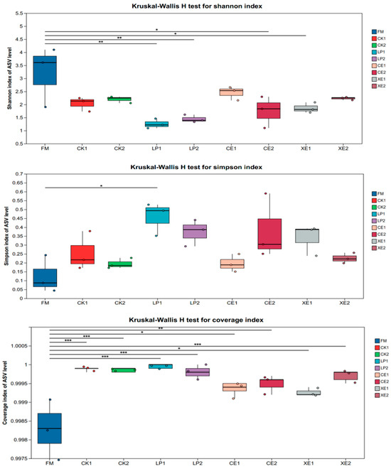 Effects of different additives and ensiling days on α diversity of broom sorghum straw silage. This figure shows the significant differences between the selected two groups of samples and marks the two groups with significant differences (0.01 < p ≤ 0.05 marked as *, 0.001 < p ≤ 0.01 marked as **, p ≤ 0.001 marked as ***). The abscissa is the grouping name, and the ordinate is the index size of each group. FM: fresh matter; CK1: CK fermentation for 30 days; CK2: CK fermentation 60 days; LP1: LP fermentation for 30 days; LP2: LP fermentation for 60 days; CE1: CE20 fermentation for 30 days; CE2: CE20 fermentation for 60 days; XE1: XE20 fermentation for 30 days; XE2: XE20 fermentation for 60 days. The same for both figures.