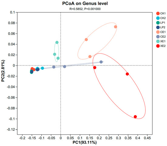The PCoA analysis of broom sorghum stems at the genus level is shown in Figure 2. After 30 days and 60 days of ensiling, the microbial flora of CK and LP did not change significantly, indicating that the microbial community structure of the two treatments did not change significantly during the whole fermentation process. However, the microflora of CE20 and XE20 changed significantly, the use of the two enzyme preparations could not keep the flora structure constant, and XE20 was the most obvious. Among them, the XE20 treatment had the most obvious difference in the flora between 30 d and 60 d of fermentation, and the three repeated flora data after 60 d of fermentation had a large degree of dispersion, indicating that there were different trends in the flora between different replicates.