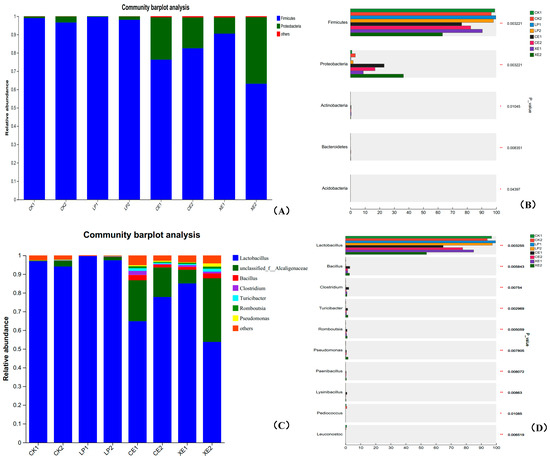 The effect of microbial community distribution of broom sorghum straw silage is shown in Figure 3. At the phylum level (Figure 3A,B), the abundance of Firmicutes was the highest in the microbial colonies of broom sorghum straw at different fermentation stages, which was the dominant bacterial group, followed by Proteobacteria, and the abundance of other bacteria was low. After 60 days of silage, except for CE treatment, the abundance of Firmicutes decreased and the abundance of Proteobacteria increased in other treatment groups. The order of variation from large to small was LP > CK > CE > XE, while the abundance of other bacteria was not obvious in the fermentation process. With the extension of silage time, the abundance of Firmicutes in CK, LP and XE decreased, and the abundance of Proteobacteria increased.