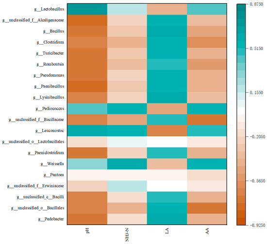 The correlation between sorghum the straw microbial community (the top 20 dominant species) and fermentation parameters was analyzed by a correlation heat map (Figure 4). The results showed that Lactobacillus was positively correlated with the fermentation parameters of sorghum straw (p < 0.05), and Lactobacillus was significantly positively correlated with pH and LA, indicating that lactic acid bacteria played a beneficial role in the decrease in silage fermentation, pH, and LA production, which could improve the fermentation quality of straw and encourage beneficial microorganisms. Unclassified _ f _ _ Alcaligenes, Bacillus, Clostridium, Turici-bacter, Romboutsia, Pseudomonas, Paenibacillus and Bacillus sphaericus were positively correlated with straw LA and negatively correlated with other fermentation parameters, indicating that these microorganisms can reduce the loss of straw nutrients by other adverse microorganisms, such as protein, while improving the fermentation quality of straw. The three genera of Micrococcus, Citrobacter and Weissella are positively correlated with NH3-N and PA. Although these three microorganisms can promote the formation of acetic acid, they will consume the protein of forage grass and reduce the nutritional quality of the straw.