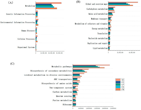 Prediction of 16S rRNA gene function of broom sorghum straw raw materials and silage samples after 60 days of fermentation. Note: (A): primary pathway level, (B): secondary pathway level, (C): tertiary pathway level; FM: straw raw materials; CK: control group; LP: Lactobacillus plantarum treatment; CE: cellulase treatment; XE: xylanase treatment.