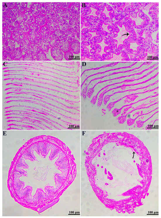 H&E-stained histological sections of M. rosenbergii (bar = 100 μm). (A) Hepatopancreas of the control group; (B) Hepatopancreas of the test group, the arrow shows loss of the star-like shape of the lumen; (C) gills of the control group; (D) gills of the test group, * shows clubbing at the tip of the gill filaments; (E) Intestine of the control group; (F) Intestine of the test group.