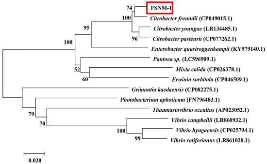 Transmission electron microscopy (TEM) was utilized to examine the FSNM-1 strain. Initially, cells were collected by centrifugation (5000 rpm, 15 min, 4 °C), then washed twice with sterilized PBS (pH 7.4). The cells were subsequently fixed in 2.5% glutaraldehyde, post-fixed with osmium tetroxide, dehydrated through a graded ethanol series, and coated with a gold-palladium alloy. Observations were made using a Zeiss EM10 transmission electron microscope (Zeiss, Oberkochen, Germany), allowing for analysis of flagella types and sizes. In addition, physiological and biochemical assays were conducted on the bacterial culture using standard plate and tube tests (Tianhe Microorganism Reagent Co., Ltd., Hangzhou, China), as outlined in Bergey’s Manual of Systematic Bacteriology [34]. Total genomic DNA from the FSNM-1 strain was extracted using the EasyPure Genomic DNA Kit (TransGen Biotech, Beijing, China) following the provided protocol. The gyrB gene sequence of the FSNM-1 strain was amplified by PCR as described by Zhang et al. [35]. The PCR products were subsequently sequenced at Nanjing Tsingke Biotechnology Co., Ltd., Nanjing, China. Sequence alignments were performed using the MEGA7.0, and a phylogenetic tree was constructed using the neighbor-joining (N-J) method. The reliability of the tree topology was assessed with 1000 bootstrap replications.