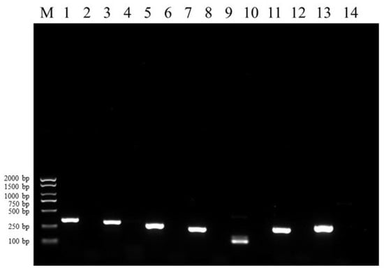 Agarose (1%) gel electrophoresis of PCR virulence gene products. M: 2000 bp DNA marker, Lane 1: cfa1, 2: negative control, 3: cfa2, 4: negative control, 5: ompX, 6: negative control, 7: ureD, 8: negative control, 9: ureG, 10: negative control, 11: ureE, 12: negative control, 13: ureF, 14: negative control.