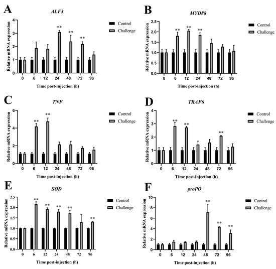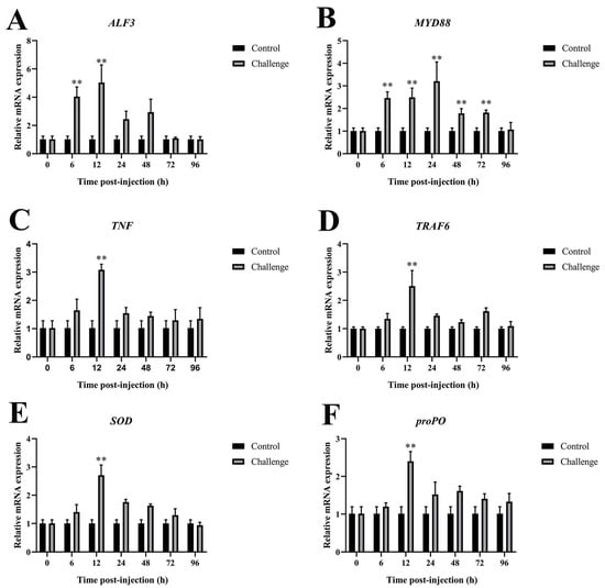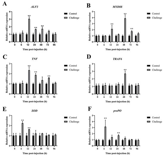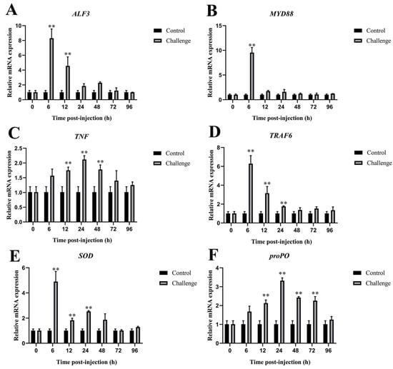 Immune-related gene expression in hepatopancreas after C. freundii infection. (A) ALF3, (B) MyD88, (C) TNF, (D) TRAF6, (E) SOD, (F) proPO. Data presented as mean ± SD, ** p < 0.01.
