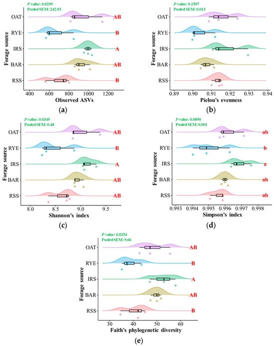 Effect of forage sources on the alpha-diversity measurements from the ruminal bacteriota of Hanwoo steers. A, B, the significant differences (p ≤ 0.05) among the forage sources. a, b, the tendencies (0.05 < p ≤ 0.10) among the forage sources. OAT, oat hay; RYE, rye silage; IRS, Italian ryegrass silage; BAR, barley forage; RSS, rice straw silage. (a) observed ASVs, (b) Pielou’s evenness, (c) Shannon’s index, (d) Simpson’s index, and (e) Faith’s phylogenetic diversity.