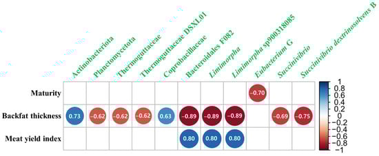 Visualized correlations between carcass traits and major bacterial taxa at the phylum, family, genus, and species levels. Only significant correlations (|r| ≥ 0.6, p ≤ 0.05) based on the Spearman correlation coefficients are visualized.