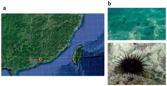 Map of the Daya Bay and the location of the urchin sampling site (a). Photos of Anthocidaris crassispina taken during sampling (b).