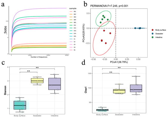 Rarefaction curves (a), principal co-ordinates analysis (b), Shannon index (c), and Chao1 index (d) of bacteria communities in the intestine, body surface, and surrounding seawater samples of sea urchin A. crassispina. ** p < 0.01.