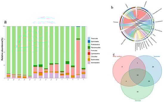 Bacterial taxonomic classification was performed on the q2-feature-classifier plugin. At the phylum level, a total of nine bacterial phyla were observed in the three types of samples (Table S1), including Proteobacteria, Firmicutes, Actinobacteria, Bacteroidetes, Planctomycetes, Cyanobacteria, Tenericutes, Spirochaetes, and Chloroflexi (Figure 3a). Among them, Proteobacteria, Firmicutes, and Bacteroidetes were the dominant bacterial phyla in this study, and Proteobacteria accounting for 66–94% of the bacterial communities as the most abundant bacteria. Firmicutes was the second most abundant phylum, constituting an average of 11.47% of the total bacterial communities. All phyla, except Chloroflexi, were found in all samples, while Chloroflexi were only observed in the seawater samples. Furthermore, based on the bacterial community composition, the abundances of Proteobacteria in the intestine and body surface samples were relatively higher than in the seawater samples, while Firmicutes and Actinobacteria were more abundant in the seawater and intestine samples compared to the body surface samples.