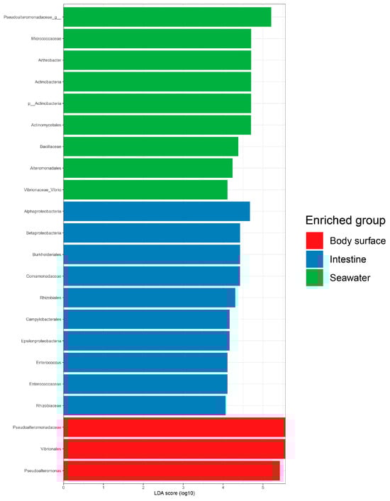 The mutual and exclusive bacterial genera was clearly demonstrated by the Venn diagram (Figure 3c). As shown in the figure, a total of 15 bacteria genera were shared by all samples, with the seawater sample hosting the highest number of exclusive genera (20). The number of bacterial genera shared between the intestine and seawater samples (18) was much higher than that shared between the intestine and body surface samples (4), indicating the environmental microbiota may contribute more significantly to the composition of the urchins’ gut microbiota. Potential biomarkers that showed the greatest differences in bacterial communities among the different sample types were predicted by LefSe analysis (Figure 4). In the urchins’ body surfaces, Vibrionales and Pseudoalteromonas were the most differentially abundant taxa. Pseudoalteromonadaceae and Arthrobacter showed the most effecting size in seawater samples while the intestine samples presented Alphaproteobacteria, Rhizobiales, and Comamonadaceae.
