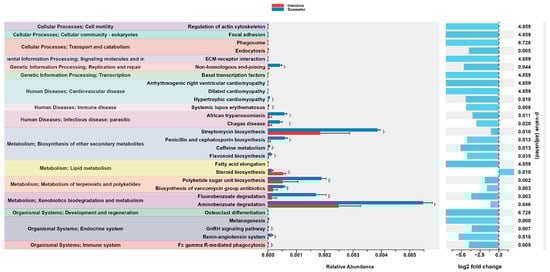 Results of the differential abundance analysis of predicted functional pathways in intestine and seawater samples. Error bar plots show a direct comparison of pathway abundance. Bar plots on the right represent log2 fold changes in the abundance of the pathways in different samples.