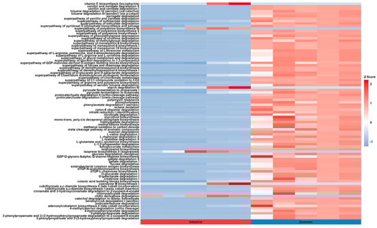 Heatmap of the significantly different predicted Metacyc pathways between intestine and surrounding seawater samples. Z score indicates the relative difference in one specific pathway in a sample from the average abundance level.