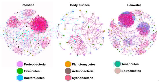 The co-occurrence pattern networks elucidate the interactions of bacterial interspecies among the body surface, intestine, and surrounding seawater of sea urchin A. crassispina (Figure 8). Among the three types of samples, the network pattern of surrounding seawater sample hosted the highest number of nodes (229) and edges (2272) and highest average degree (19.834), with relatively low positive correlations (71.57%), modularity (0.617), and density (0.087) among all edges. In the intestine sample, the network pattern consisted of 178 nodes, 1437 edges, and an average degree of 16.146, with 87.13% positive correlations, a modularity of 0.622, and a density of 0.091. The body surface sample had the lowest number of nodes (47) and edges (104) and the lowest average degree, but showed the highest positive correlations (88.46%), modularity (0.759), and density (0.096). These topological characteristics comprehensively illustrated the complexity, stability, connectivity, and interaction patterns in the three types of samples.
