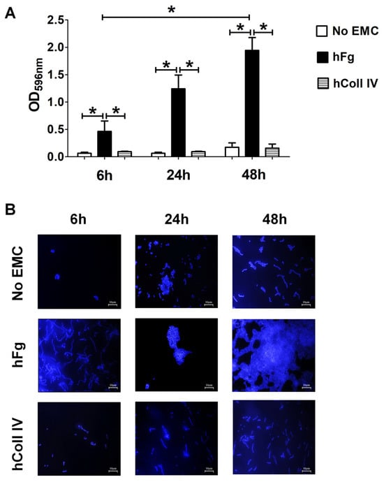 Biofilm formation by GBS on human fibrinogen. (A) Biofilm formation abilities of NEM316 wild-type (WT) strain on twelve-well plates coated with human fibrinogen (hFg) and collagen type IV (hColl IV) or without any extracellular matrix component (no EMC). GBS growth as biofilm was followed for 6, 24, and 48 h and verified with CV staining. Bacterial biomass was quantified by measuring the optical density at 596 nm (OD596nm). Results are means ± SD from three independent experiments performed in triplicate. * p < 0.05, as determined by Mann–Whitney statistical analysis. (B) Fluorescence microscopy analysis of GBS biofilm morphology over hFg. After growth in the conditions described in A, biofilms were stained with 4′,6-diamidino-2-phenylindole (DAPI, blue), which labeled DNA. In the absence of extracellular matrix components (no EMCs) or in the presence of hColl IV, only few and small scattered cell clusters or small aggregates are visible. In hFg-coated coverslips, a network of numerous, thick cell layers and shaped, rough biofilms are observed. Shown are representative images of three independent experiments. Scale bar = 10 µm.