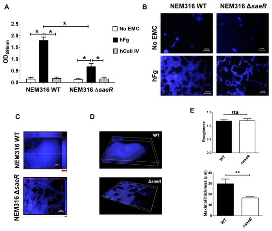 SaeR regulates GBS biofilm formation over human fibrinogen. (A) Biofilm formation abilities of NEM316 wild-type (WT) and NEM316 deleted for saeR (ΔsaeR) strains on twelve-well plates coated with human fibrinogen (hFg) and human collagen type IV (hColl IV) or without any extracellular matrix components (no EMCs). GBS growth as biofilm was analyzed at 48 h and verified with CV staining. Bacterial biomass was quantified by measuring the optical density at 596 nm (OD596nm). Results are means ± SD from three independent experiments performed in triplicate. * p < 0.05, as determined by Mann–Whitney statistical analysis. (B) Morphological differences among GBS biofilms on hFg. WT and ΔsaeR biofilms on hFg or uncoated wells (no EMCs) were visualized with 4′,6-diamidino-2-phenylindole (DAPI, blue). Shown are representative images of three independent experiments. Scale bar = 10 µm. (C) Assembly of bacteria in biofilm formed on hFg. Z-stack sections of 48-h-old GBS biofilms on hFg, with orthogonal views from x/z and y/z planes showing the distribution of bacterial genome stained with 4′,6-diamidino-2-phenylindole (DAPI, blue). Differences in biofilm height are indicated with red arrows. Shown are representative images of three independent experiments. Scale bar = 10 µm. (D) Three-dimensional reconstruction representative of hFg-biofilms formed by WT and ΔsaeR mutant GBS strains after 48 h. Bacteria were stained with 4′,6-diamidino-2-phenylindole (DAPI, blue); (E) COMSTAT-2 quantification of maximal thickness (µm) and dimensionless roughness coefficient in biofilms formed on hFg at 48 h by WT and ΔsaeR strains. ns, not significant; ** p < 0.01, as determined by Mann–Whitney statistical analysis. Data are from five different independent experiments.