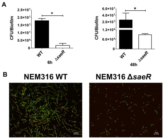 Streptococcal viability on biofilms formed on human fibrinogen. (A) Viability of NEM316 wild-type (WT) and NEM316 deleted for saeR (ΔsaeR) strains on twelve-well plates coated with human fibrinogen (hFg). Biofilms at 48 h were detached with trypsin (1 mg/mL) and disaggregated by vigorously pipetting to enumerate colony forming units (CFUs) of WT and ΔsaeR strains. Results are means ± SD from three independent experiments performed in triplicate. * p < 0.05, as determined by Mann–Whitney statistical analysis; (B) fluorescence images of 48-h-old GBS biofilms on hFg. WT and ΔsaeR biofilms were incubated with orange acridine (OA), with viable and dead cells staining in green and red, respectively. Shown are representative images of three independent experiments. Scale bar = 10 µm.