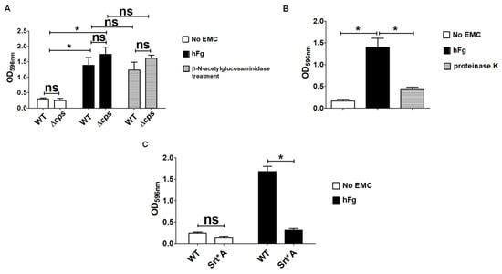 The polysaccharidic capsule represents the most important virulence factor of GBS by virtue of its ability to prevent complement activation and to enable bacteria to evade phagocytic killing. Moreover, the capsular polysaccharide was shown to mediate the biofilm formation by GBS grown under static conditions in the presence of human plasma []. In light of this, we wondered if the GBS capsule could play a role in the biofilm formation on hFg. To this end, we compared a capsule-deleted mutant (Δcps) with the parental WT strain for biofilm formation on hFg-coated surfaces. However, no differences between the Δcps and the WT strain were noted in the stainable biomass assembled on hFg, suggesting that the capsule is not required for biofilm formation (Figure 4A). As biofilms contain a self-produced matrix containing numerous biomolecules, including polysaccharides and proteins, a common approach to study biofilm composition involves enzymatic treatments. Therefore, we treated the WT and Δcps biofilms with the enzyme β-N-acetylglucosaminidase that cleaves β-(1,6)-linked poly N-acetyl glucosamine (PNAG), which is a major component of the exopolysaccharides of the biofilms produced by Gram-negative and Gram-positive bacteria []. The latter enzymatic treatment did not disrupt, to any significant degree, the biofilms formed by either encapsulated or unencapsulated bacteria (Figure 4A). In contrast, when preformed 48-h-old biofilms were treated with proteinase K, we noted a significant reduction in terms of CV staining (Figure 4B). We added proteinase K only to preformed mature biofilms in order to avoid proteolytic destruction of the Fg coating, which would have prevented early biofilm formation.