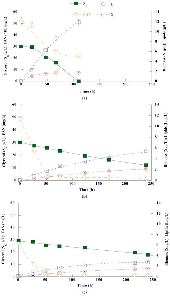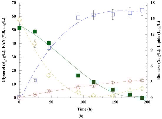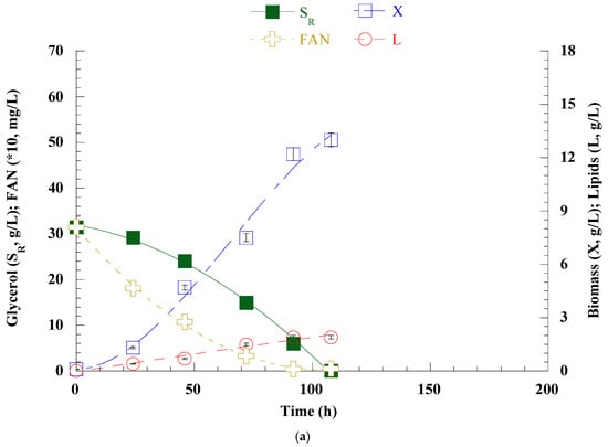 According to the results, glycerol was completely consumed within 108 and 192 h in experiments with initial concentrations of S0 ≈30 and ≈50 g/L, resulting in 13.0 and 16.6 g/L of dry biomass, respectively. The FAN was completely consumed in both cases; however, a slight increase was observed at the end of the culture in the second experiment, which could be attributed to cell death and the release of proteins into the medium.