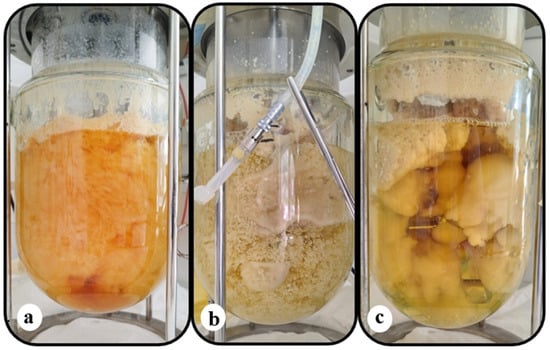 Scale-up cultivation of C. elegans NRRL Y-1392 in a laboratory-scale batch bioreactor (Vw = 1.8 L–C/N = 18.3 mol/mol–1.5 vvm–900 rpm) with an initial spore population of approximately 60,000 spores/mL of broth. During the initial days of the culture, a cloudy mycelial formation with numerous tiny pellets and excreted carotenoids was observed (a), and the broth was subsequently decolorized, and many dense suspended pellets were formed (b). Eventually, these pellets formed compact mycelial biomass, settled on the solid surfaces of the bioreactor (c).