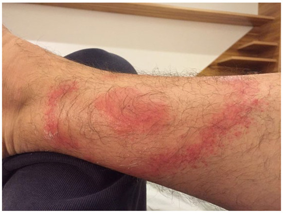 A 40-year-old Brazilian man living in São Paulo was bitten by a tick in the Amazon rainforest on the volar aspect of the distal third of the right forearm. Erythema migrans, with the typical “bull’s eye” appearance, developed after two weeks, as depicted in Figure 3. The patient also had fever and headache. Positive anti-Borrelia antibodies in an IgM ELISA were confirmed by Western blot (OspC); ANAs were negative. The patient was treated according to the Yoshinari protocol (ceftriaxone iv followed by doxycycline and hydroxychloroquine). EM and fever disappeared after one week and headache after two weeks.