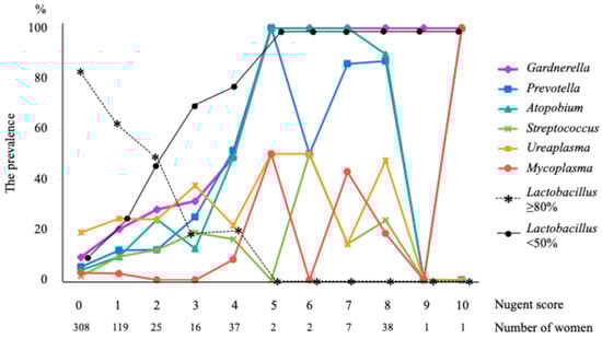 | Nugent Score | Number | Lactobacillus Species <50% (%) | Presence of BV-Associated Bacteria Species (%) | Presence of ≥Two BV-Associated Bacteria Species (%) | BV-Associated Bacteria Species | Miscarriage/Preterm Birth-Associated Bacteria Species | ||||