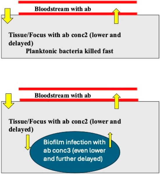 The PK/PD problem of the third micro-compartment of bacterial biofilms is difficult to solve due to side effects of antibiotic therapy if too high dosages are used (Figure 6 and Figure 7) [13,49]. However, topical dosing of antibiotics, e.g., by inhalation, may circumvent the problem of most side effects since inhaled antibiotics are virtually not absorbed into the blood, and this is, therefore, an established way of therapy which improves the clinical condition of patients, although it does not eradicate the biofilm infection [48,50,51,52].