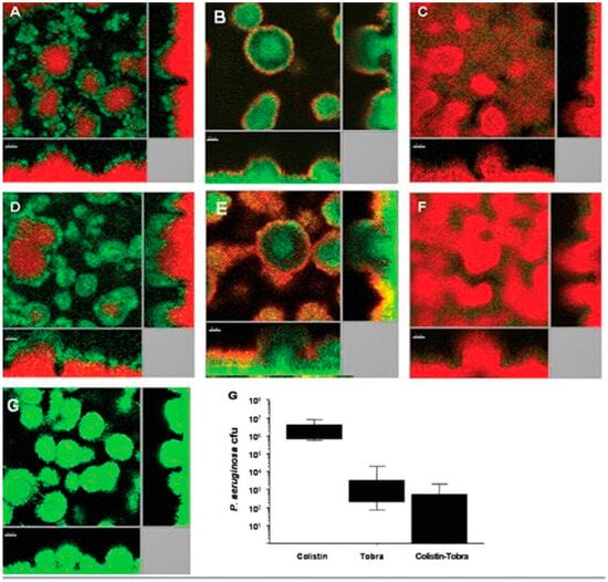 The distribution of dead and live cells in P. aeruginosa biofilms in a flow cell visualized by three-dimensional confocal laser scanning microscopy from the top and from two sides. The three-dimensional imaging of the biofilm allowed for the localization of dead (red) and surviving (green) bacteria in the mushroom-like biofilm structures. Biofilms were grown in laminar flow for 4 days at 30 °C and then were continuously exposed to 10 × the minimum inhibitory concentration (MIC) of colistin (A,D), tobramycin (B,E) and a combination of both drugs (C,F) for 24 h (A–C) and 48 h (D–F). (G) The untreated P. aeruginosa biofilm. Live cells appear green as a result of green fluorescent protein expression, and dead cells appear red because of propidium iodine staining (propidium iodine does not penetrate the cell wall of living bacteria). Colistin kills the dormant deep center part of the biofilm, tobramycin kills the metabolizing surface of the biofilm and colistin + tobramycin kills the entire biofilm (synergy). The right lower part of the figure (also named (G)): The efficiency of antibiotics against P. aeruginosa in a rat lung biofilm infection model. Rats were challenged intratracheally with alginate beads containing 1 × 108 cfu/mL P. aeruginosa strain PAO1 (cfu = colony forming units) and then treated with 64× the minimum inhibitory concentration of colistimethate sodium (colistin), tobramycin (tobra) or combinations of these antibiotics. After 7 days, the P. aeruginosa cfu were determined and the results for colistin vs. tobra, colistin vs. colistin–tobra, and tobra vs. colistin–tobra were all significantly different, p < 0.05. (Reproduced from ref. [42] by permission).