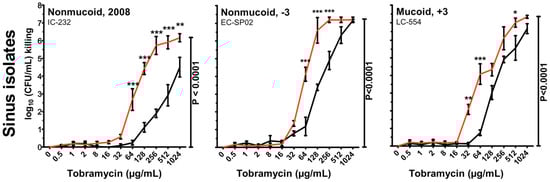 Tobramycin killing of three anoxic aggregating (biofilms) not-related P. aeruginosa isolates from sinus paranasales of three different CF patients (IC-232 isolated 2008 (non-mucoid phenotype), EC-SP02 from 2008 (non-mucoid phenotype) taken 3 years before (−3) chronic lung infection started, LC-554 from 2010 (mucoid phenotype) taken 3 years after (+3) the onset of chronic biofilm infection). The aggregates were grown at 37 °C in the agarose-embedded aggregate model for three days during anoxic conditions with NO3− as the electron acceptor. The effect of anoxic (black line) or hyperbaric oxygen (90 min. at 100% O2 at 2.8 bar, red line) conditions; error bars indicate the mean ± SEM (n = 3). Two-way ANOVA with Bonferroni multiple comparison tests; *: p ≤ 0.05, **: p ≤ 0.01 and ***: p ≤ 0.001. (The mean tobramycin concentration in the sputum of cystic fibrosis patients during tobramycin inhalation therapy is >1024 µg/mL [48].) (Reproduced from reference [47] with permission.)