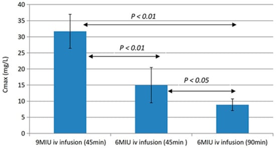 A comparison of the peak concentration (Cmax) of colistin in plasma with IV infusion of one dose of 6 International Million Units (IMIU) and 9 IMIU colistinmethate sodium in 5 cystic fibrosis patients. Compare Figure 6 (mice) and Figure 7 (cystic fibrosis patients). (Reproduced from ref. [49] with permission.)