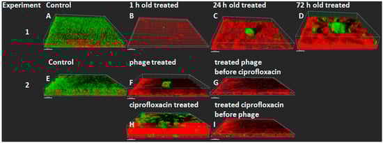 (1) The effect of a single phage treatment on P. aeruginosa PAO1 biofilms of different ages in flow cells. (2) The effect of a combination of phage and ciprofloxacin treatment on PAO1 biofilms. Living cells are green cells (tagged with green fluorescent protein) and dead cells are red (propidium iodide staining). The images show perspective 3D biofilm views. The scale bars are 30 µm. (1) (A), control; (B), phage treatment of a 1 h old biofilm; (C), phage treatment of a 24 h old biofilm; (D), phage treatment of a 72 h old biofilm. (2) (E), control; (F), phage treatment of a 24 h old biofilm; (G), combination treatment of phages followed 5 h later by continuous treatment with ciprofloxacin (0.5 mg/L). (H), continuous treatment with ciprofloxacin (0.5 mg/L) of a 24 h old biofilm; (I), combination treatment with ciprofloxacin followed 5 h later by the addition of phages. (1) Early treatment (1 h biofilm) was most efficient, whereas later treatment gave rise to phage-resistant biofilm colonies (green, (C,D)). Ciprofloxacin treatment also gave rise to ciprofloxacin-resistant colonies (green, (H). Combination treatment with ciprofloxacin and the phage was efficient and prevented the development of resistance independent of the sequence of phage and ciprofloxacin treatment (G,I). (Treatment with a mixture of 3 different phages or the use of each individual phage gave similar results.) (Reproduced from reference [55] with permission.)