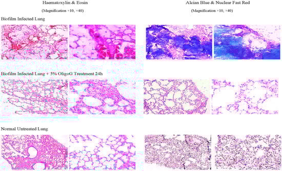 Histopathology of Hematoxylin- and Eosin-stained and Alcian Blue-stained (polysaccharide staining) and Nuclear Fast Red-stained (staining of nuclei) sections of lung tissues from controls and OligoG-treated mice. Mice treated with OligoG exhibited a marked reduction in Alcian blue staining of the alginate, reflecting the significant disruption of biofilms in the infected lungs. (The OligoG used is the OligoG CF5/20 which was used for a clinical trial in cystic fibrosis patients as a solubilizer of sputum.) (Reproduced from ref. [52] with permission.)