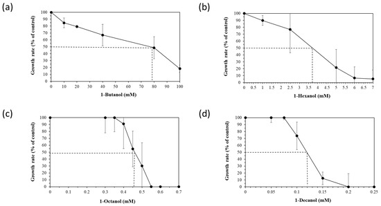 Growth rates (black circles) and trans/cis ratios (white diamonds) of H. aestusnigri incubated with different n-alkanols: (a) 1-butanol, (b) 1-hexanol, (c) 1-octanol and (d) 1-decanol. The EC50 (effective concentration for reducing cell growth by 50% compared to the control) is represented by a dotted line. n = 3.