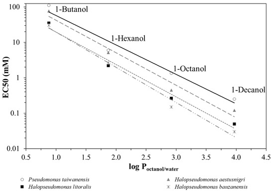By plotting the EC50 values as a function of the partitioning coefficient between octanol and water, log Poctanol/water [26] of the respective alkanol (Figure 2), it can be seen that P. taiwanensis VLB120 outperforms the Halopseudomonas strains regarding its robustness against n-alkanols of increasing hydrophobicity. H. aestusnigri can be considered the most tolerant among the strains tested. Typically, substances with a log Poctanol/water between 1 and 4, such as long-chain alkanols, aromatics and esters, exhibit toxicity to microorganisms even at very low concentrations because they tend to accumulate in the cytoplasmic membrane [36,37,38].