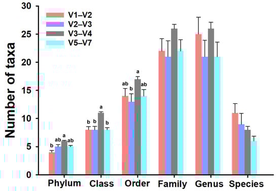 Number of taxa detected by each hypervariable region. The bars represent the average number of taxa detected in all samples by each region at different taxonomy levels. Error bars represent the standard error for each group (n = 10). Different letters indicate significant differences between groups (p < 0.05).