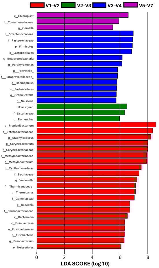 The analysis of microbiome differential abundance carried out with LEfSe is shown in Figure 6, where the bar chart represents the distribution of differentially abundant taxa (at different levels) discriminated by each hypervariable region. A total of 39 high-dimensional biomarkers were discovered among all regions. Most of these were determined by the V1–V2 region (21), where the most significantly overrepresented taxa belong to the family Enterobacteriaceae and the genera Propionibacterium and Staphylococcus with a high LDA score > 8, highlighting the potential importance of these taxa as biomarkers of this region. Instead, the V3–V4 region was mostly associated with the Streptococcaceae and Pasteurellaceae families, the Lactobacillales order, and the Firmicutes phylum (LDA score > 6). A smaller number of differentially expressed taxa were identified by the rest of the regions. The taxa Listeriaceae (family) and Escherichia (genus) were discriminated by the V2–V3 region and the Comamonadaceae (family), Chloroplast (class) and Gemella (genus) by the V5–V7 region (Figure 6).