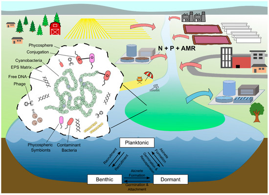Despite being viewed as separate concerns, AMR and HABs share many similarities and connections (Figure 2). Both occur where exposure risks are imperative to address (e.g., drinking water sources and public beaches) [86,87] and where microbes such as human pathogens are likely to co-mingle and accumulate (e.g., catchments of wastewater and agricultural runoff) [88,89,90,91]. Both are facilitated by global climate change [92,93] and “cultural eutrophication”—the process by which nutrients from anthropogenic sources interfere with ecological community dynamics and biogeochemical cycles [94,95,96]. Both have called for the identification and enumeration of microbial species, the tracking of microbial activity, and the profiling of microbial traits to protect the environment and human health [97,98]. Both can also be linked at the cellular level [99,100], as HAB-forming cyanobacteria often possess ARGs and can potentially exchange ARGs with other microbes (e.g., via plasmids) [101,102]. These same cyanobacteria host a diversity of heterotrophic microbes within the mucus that encapsulates their cells (their phycospheric symbionts) [103,104], which often likewise possess ARGs and the ability to exchange ARGs with other microbes [99,105]. Whether or not ARGs in this context can exacerbate HABs, they can exacerbate water quality issues tied to HABs, such as the cyanobacterial contamination of crops [106,107] and hospital dialysate [108] and the cyanobacterial colonization of human respiratory tracts [109]. Reciprocally, the occurrence of HABs may increase ARG diversity within planktonic microbial communities [110].