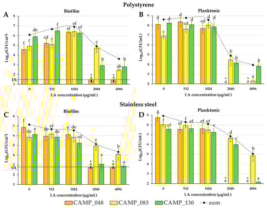 Biofilm and planktonic logarithmic populations (Log10 CFU/cm2 and Log10 CFU/mL, respectively) of each individual Campylobacter isolate (CAMP_048, CAMP_083, and CAMP_130) of the mixed-culture consortium, following the 48 h of incubation at 42 °C in MH-CJ broth, under microaerophilic conditions, and in the presence of the four tested LA concentrations (i.e., 512, 1024, 2048, and 4096 μg/mL; corresponding to the initial broth pH values of 5.41 ± 0.01, 4.47 ± 0.02, 3.87 ± 0.01, and 3.43 ± 0.03, respectively) for the two different biofilm formation experiments (PS and SS). (A). Biofilm populations on PS; (B). Planktonic populations in the surroundings of PS biofilms; (C). Biofilm populations on SS; (D). Planktonic populations in the surroundings of SS biofilms. The populations of the positive biofilm-forming control (without LA; 0 μg/mL) are also shown in each graph (initial broth pH value of 6.76 ± 0.02). Each bar denotes the mean values ± standard deviations. The total logarithmic populations (sum) for each treatment are shown as rhombuses connected by dotted curved lines. For clarity, standard deviation bars for those total population means were omitted. In each graph, the mean values followed by different superscript letters (a–f) differ significantly (p < 0.05). Population counts below the detection limits of the plate counting methods (1.47 Log10 CFU/cm2 for PS and 2.77 Log10 CFU/cm2 for SS, respectively) are denoted with asterisks (*) and inverted down arrows.