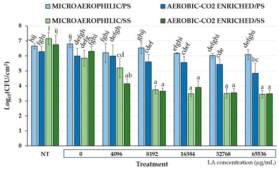 Total biofilm logarithmic populations (Log10 CFU/cm2) of the mixed-culture consortium following the 15 min LA exposure (disinfection). Prior to disinfection, biofilms had been left to be formed on either PS or SS surfaces incubated for 48 h at 42 °C in MH-CJ broth, under either microaerophilic or aerobic (and CO2-enriched) conditions. LA was tested in five different aquatic concentrations (i.e., 4096, 8192, 16,384, 32,768, and 65,536 μg/mL; corresponding to pH values of 2.91 ± 0.06, 2.73 ± 0.02, 2.49 ± 0.03, 2.29 ± 0.02, and 2.11 ± 0.02, respectively). The biofilm populations of the negative disinfection control (dH2O; 0 μg/mL LA; pH 7.17 ± 0.18) are also shown, together with those for the non-treated (NT) sample. Each bar denotes the mean values ± standard deviations. The mean values followed by different superscript letters (a–j) differ significantly (p < 0.05).