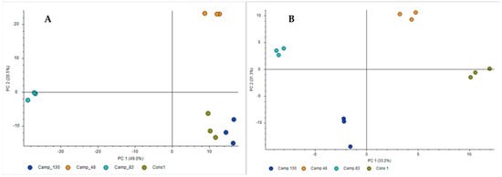 PCA score plots of LC-MS/MS-based metabolic profile from Campylobacter monocultures (CAMP_048, CAMP_083, and CAMP_130) and mixed-culture consortium (CONS1) in ESI+ (A) and ESI− (B) modes. The percentage on each axis represents the proportion of variance (R2X) explained by principal component one or two (PC1 or PC2).