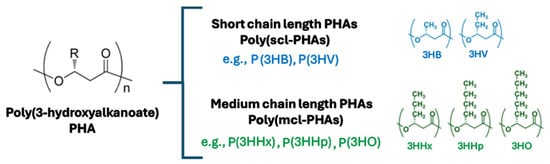 Polyhydroxyalkanoates (PHAs) are long polymeric molecules that contain ester linkages in their structure and are widely used in the medical field. They have the potential to be used in other applications due to their biocompatibility and biodegradability. The PHA family can be classified structurally into two groups: short-chain-length (scl) (three to five carbons) and medium-chain-length (mcl) (six to twelve carbons) groups. In addition, PHAs can exist as homopolymers or copolymers, depending on the similarity or diversity of their monomer unit composition (Figure 1). This is determined by the specificity of the PHA synthase enzymes involved in their synthesis [1]. Examples of short-chain-length PHAs include poly(3-hydroxybutyrate) P(3HB), poly(4-hydroxybutyrate) P(4HB), and poly(3-hydroxyvalerate) P(3HV) or the copolymer P(3HB-co-3HV). In contrast, examples of medium-chain-length PHAs include homopolymers such as poly(3-hydroxyhexanoate) P(3HHx), poly(3-hydroxyoctanoate) P(3HO), poly(3-hydroxydodecanoate) P(3HDD) and copolymers, such as P(3HHx-co-3HO). P(3HB), a homopolymer comprising four carbon subunits of 3-hydroxybutyrate (3HB), is the most prevalent and extensively studied member of the PHA family [2,3,4].