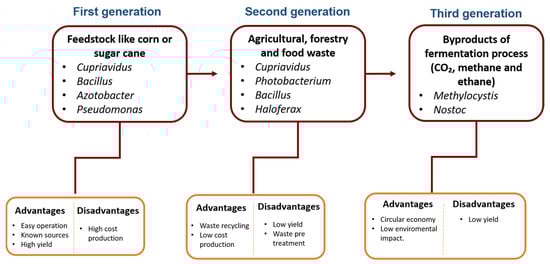 More recently, studies have focused on the use of the byproducts generated during fermentation processes, such as glycerol, methane and carbon dioxide (CO2), as well as wastewater, using methanotrophic, halophilic organisms and also those that are capable of reducing CO2 in formic acid. On the other hand, photoautotrophic cyanobacteria using CO2 (e.g., from the air) as carbon and (sun-)light as energy are potential sources for the synthesis of PHAs. This last generation method could offer new opportunities to reduce environmental impacts and take advantage of the products generated in different fermentation processes in a circular and sustainable economy scheme, aimed at lowering production costs and making bioplastic production processes more environmentally friendly. Figure 2 describes the characteristics of each stage or generation, as well as the advantages and challenges that have been faced in each of these, highlighting the fact that in each generation, progress is made in obtaining a product at a lower cost and with a lower environmental impact. In the following sections, some examples related to microbial sources and raw materials, described in each generation, will be discussed.