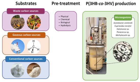 A schematic representation of P(3HB-co-3HV) production using different raw materials is shown in Figure 3. Studies in different bacteria have reported the production of P(3HB-co-3HV) in shake-flask, batch, extended batch and fed-batch cultures [20,36,37,38,39].