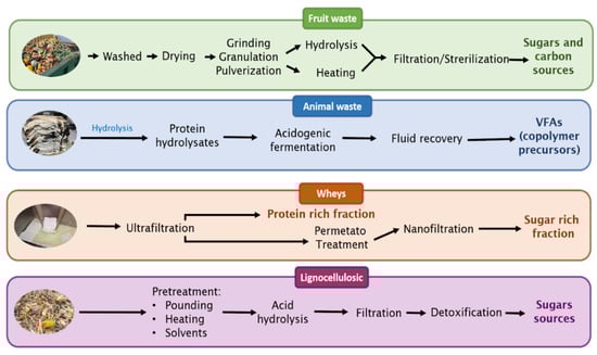 As mentioned, plastic products are derived from fossil fuels, leading to severe environmental concerns [47]. P(3HB-co-3HV) production using waste carbon from agro-industrial sources presents a great alternative to minimize the production costs of bioplastics; however, its use depends on prior treatment. The process can consist of washing, drying, rupturing, spraying, sifting, hydrolysis, filtration and sterilization. Figure 4 shows the main pretreatments of different agricultural wastes according to the kind of waste. To incorporate agricultural waste (crop waste, animal waste, processing waste and hazardous waste), it is necessary to carry out some pretreatments to integrate the different nutrients into the broth culture. All waste has different structures and compositions; therefore, treatments must be designed that take into account the nature of the waste.