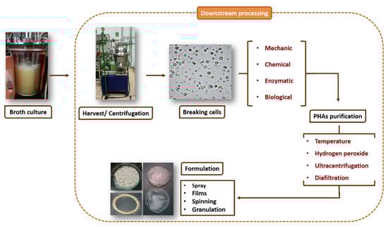 PHAs are intracellular products; therefore, in general, three stages are required to obtain the final product: (1) cell breakdown; (2) the extraction or separation of PHA granules from cellular remains; and (3) the purification of the biopolymer granules. In general, three methods of cell breakdown can be identified: (1) the mechanical disruption of the residual biomass; (2) the chemical digestion of residual biomass by the application of chemical products; and (3) biological digestion by adding biocatalysts or acellular components that can lyse cells such as bacteriophages [64,65,66] (Figure 5).