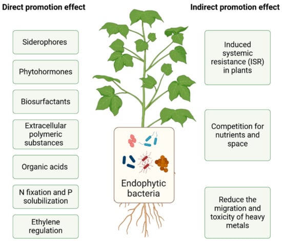 - Biosorption. Biosorption is a process in which the functional groups on the cell wall of endophytes bind metal ions to their cell surface, and the cell surface accumulates heavy metals through adsorption, thereby reducing the toxicity of heavy metals to plants. This method can rapidly transfer heavy metal ions into the cells to limit their movement, thereby reducing their toxicity [18]. The bacterial cell wall usually has a negative charge, which enables it to easily react with metals in the outer membrane of the cell, and it is highly effective at forming complexes with dissolved heavy metal ions [19,20]. Raheem et al. [21] found Bacillus amyloliquefaciens RWL-1 could adsorb copper (Cu) ions on RWL-1 cell surfaces, which enhanced the seedling biomass of rice (Oryza sativa) and increased its levels of antioxidants.
