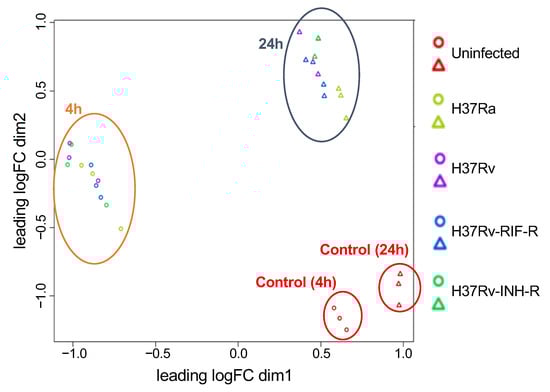 Multidimensional scaling (MDS) plot based on the expression of all microarray genes between M. tuberculosis-infected and mock-infected THP-1 cells at two time points of infection. Circles represent data based on 4 h post-infection, and triangles depict data based on 24 h post-infection. Each specifically colored circle or triangle represents a replicate of each sample.