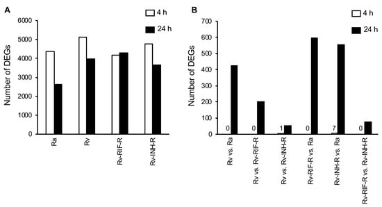 Number of differentially expressed genes (DEGs) in THP-1 cells at 4 h and 24 h post-infection (p < 0.05). (A) M. tuberculosis-infected cells relative to mock-infected cells. (B) Pairwise comparisons of M. tuberculosis-infected cells.