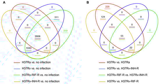 Venn diagrams of DEGs in THP-1 cells at 24 h post-infection (p < 0.05). The overlapping genes represent the overall number of DEGs between the different comparison groups, while the non-overlapping numbers designate the unique genes to each group. (A) Pairwise comparisons between M. tuberculosis-infected and mock-infected cells. (B) Pairwise comparisons between M. tuberculosis-infected cells.
